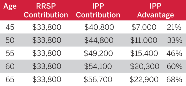 An IPP is similar to an RRSP in that it uses an investment account to accumulate assets over time as retirement benefits. However, unlike the RRSP, an IPP allows for the accumulation of greater assets – up to 68% more than an RRSP – and like a traditional pension plan, sets your monthly income at retirement. An IPP also provides certain additional guarantees beyond an RRSP to further protect your financial future (assets accumulated within an IPP are locked-in and may be used only for retirement purposes).